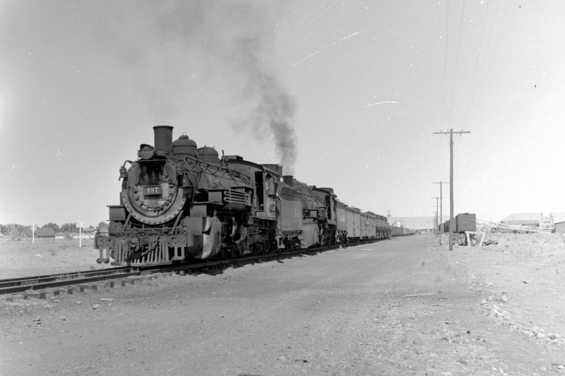 | Photo of the Week for Aug 21, 2011 - Aug 27, 2011 Do you recognize this location? Here we see two K-37s - 497 and an unidentifiable engine - pulling a reefer, two boxcars, and five empty oil tanks westward out of Antonito. Today, this is the stub end of the SLRG wye, and the C&TS station would be on the right. Photograph by: Unknown photographer, Nathan Holmes collection Back to the Photo of the Week Index... | |