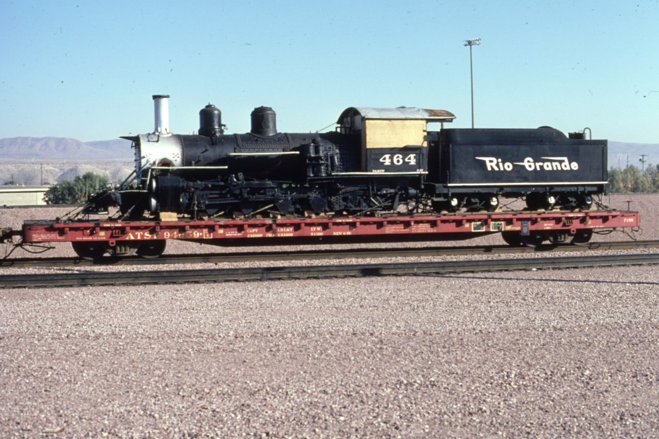 | Photo of the Week for Sep 11, 2011 - Sep 17, 2011 D&RGW hitches a ride on a standard gauge flat for its third cross-country trip. The first was obviously from Baldwin to the Grande, and the second was in 1973 when it was sold to Knotts Berry Farm in California. They restored it and ran it for a couple seasons, but eventually found it unsuitable for their tight loop. So, in 1981, it was bundled up again and sent to the Huckleberry Railroad in Michigan, where it continues to operate in top notch condition today. Here we see it on flat ATSF 94658 at Barstow, CA. Photograph by: Unknown photographer, Nathan Holmes collection Back to the Photo of the Week Index... | |